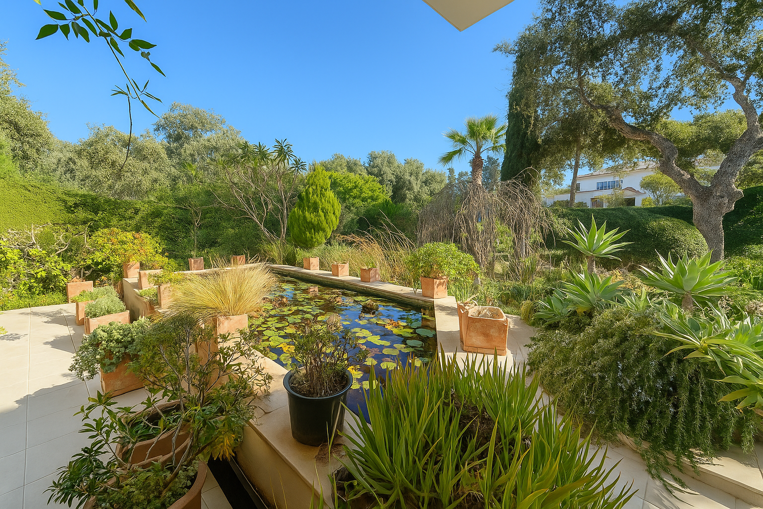 Das Grundstück liegt in leichter Hanglage und bietet zwei wunderschöne Gärten: einen sonnigen, südlich ausgerichteten Vorgarten und einen privaten rückwärtigen Garten, der ganz dem mediterranen Outdoor-Leben gewidmet ist. Hier erwarten Sie eine Pergola, ein Swimmingpool, eine Sommerküche und ein Grillbereich – perfekt, um das Klima Sotograndes in vollen Zügen zu genießen.