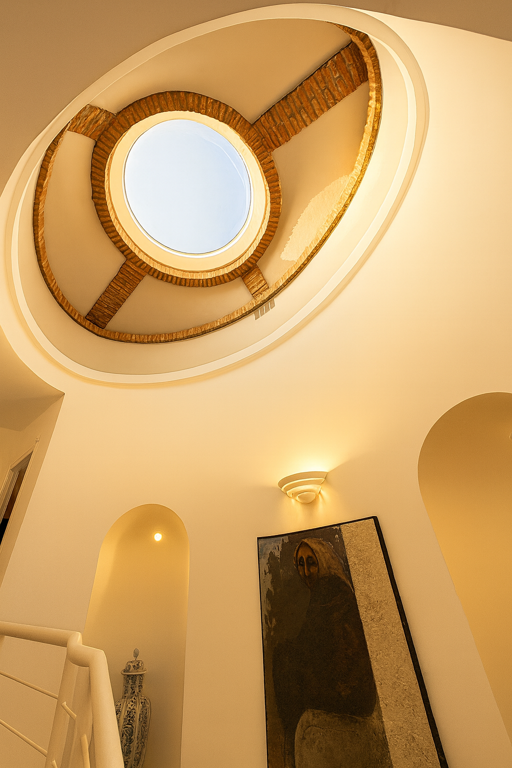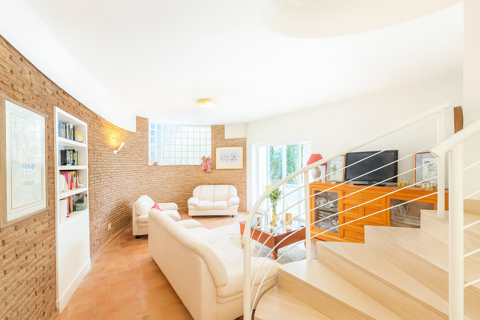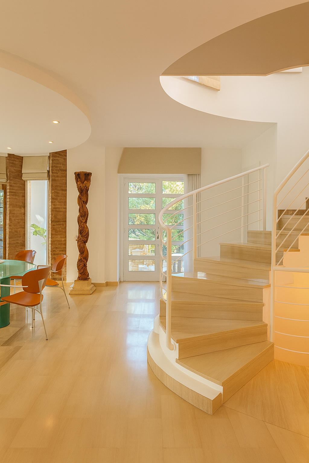 Der Eingangsbereich beeindruckt mit einem gewölbten Deckengewölbe und führt in ein imposantes Wohnzimmer mit doppelter Raumhöhe, einen formellen Essbereich sowie eine voll ausgestattete Küche mit Frühstücksecke. Auf dieser Ebene befinden sich außerdem ein Gästeschlafzimmer, ein Gäste-WC sowie ein vielseitig nutzbarer Salon, der sich auch als Hauptschlafsuite mit eigenem Bad eignet.