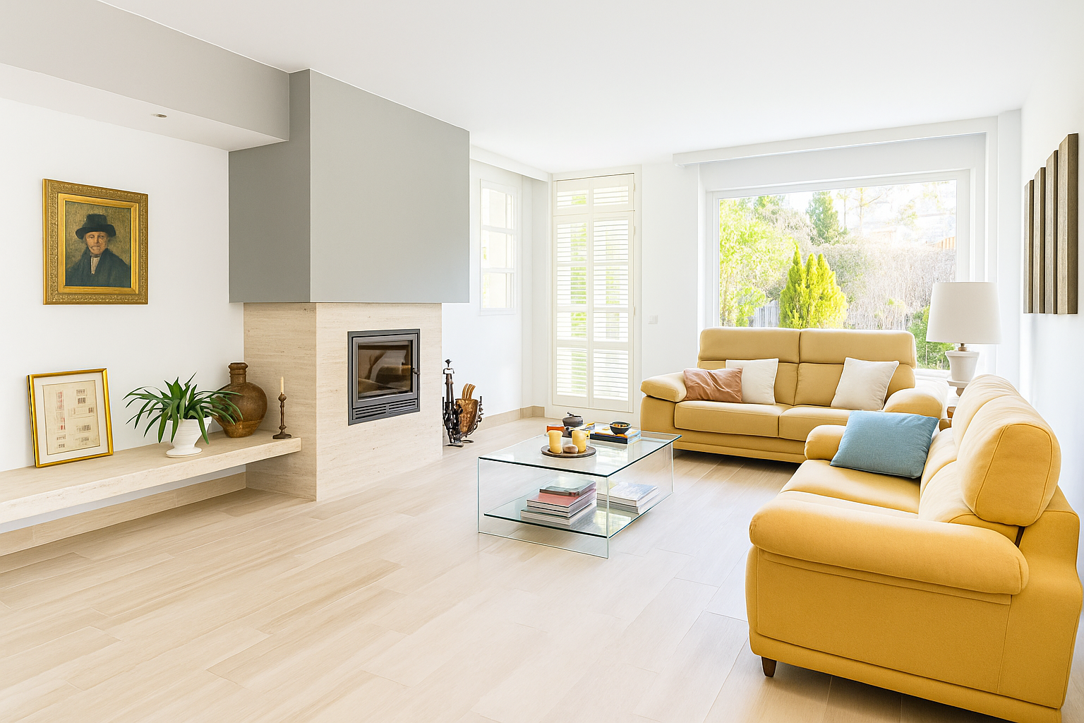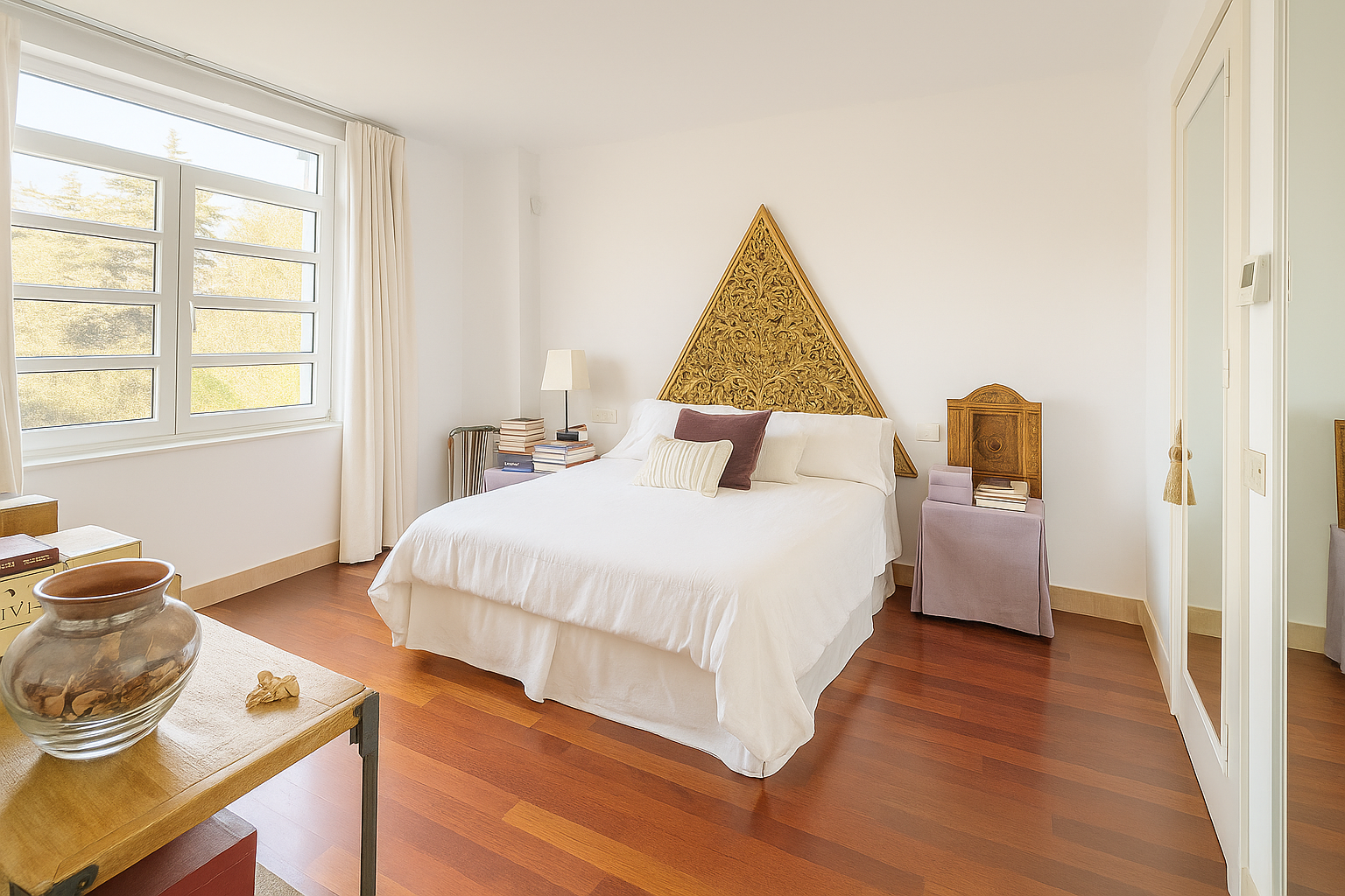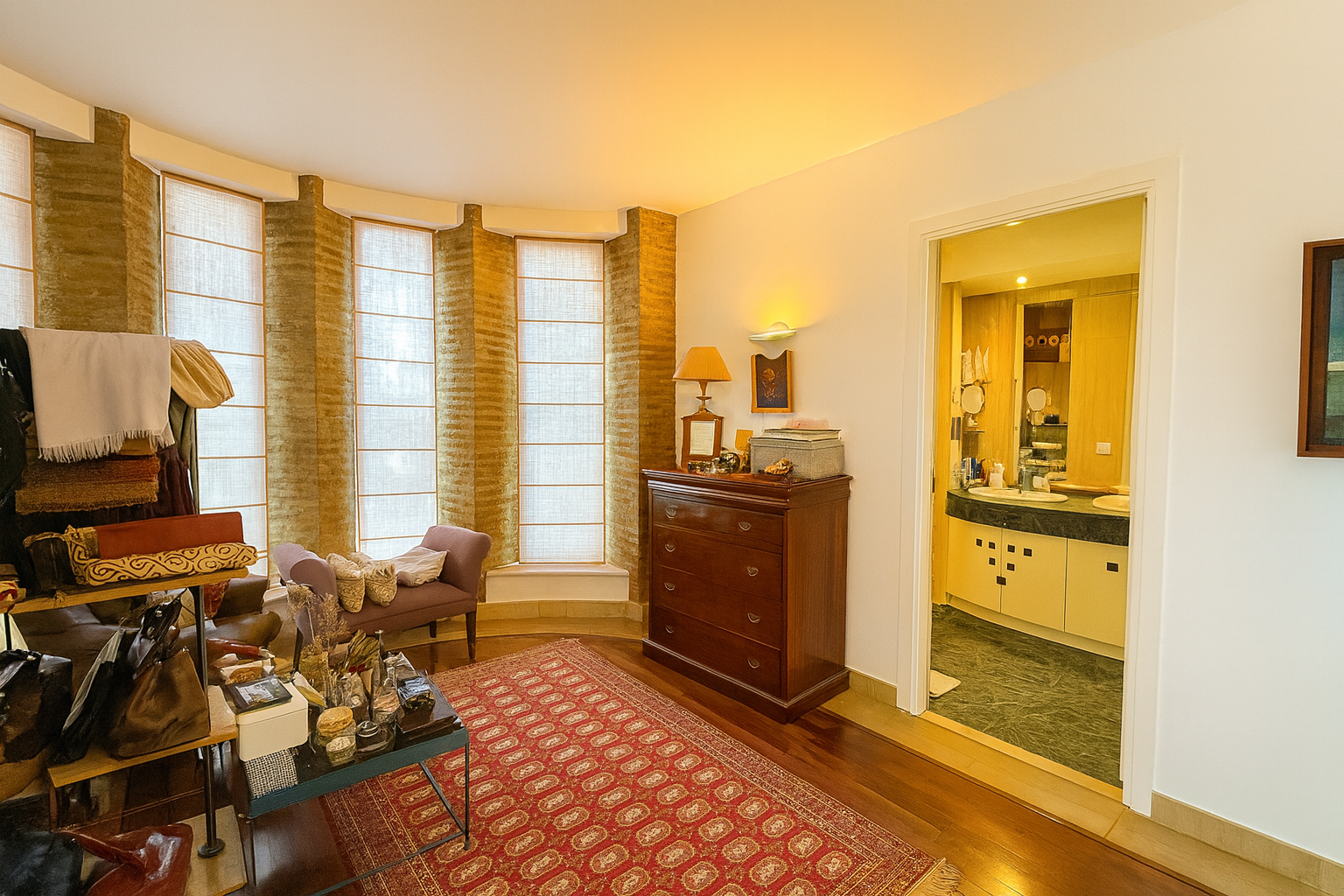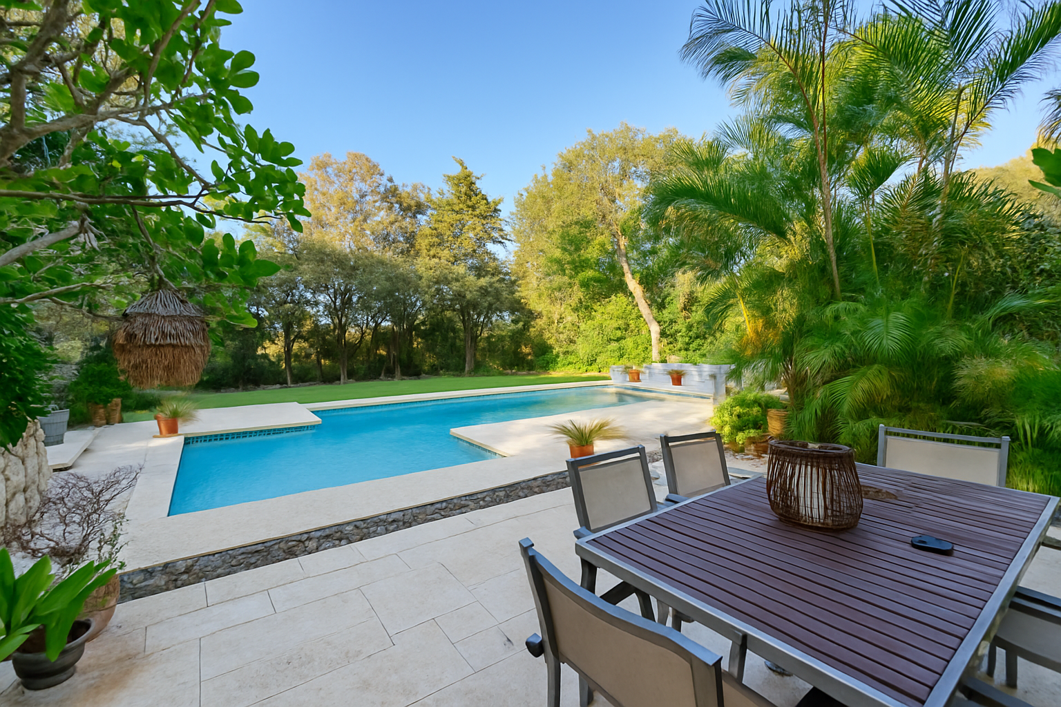 Der Eingangsbereich beeindruckt mit einem gewölbten Deckengewölbe und führt in ein imposantes Wohnzimmer mit doppelter Raumhöhe, einen formellen Essbereich sowie eine voll ausgestattete Küche mit Frühstücksecke. Auf dieser Ebene befinden sich außerdem ein Gästeschlafzimmer, ein Gäste-WC sowie ein vielseitig nutzbarer Salon, der sich auch als Hauptschlafsuite mit eigenem Bad eignet.