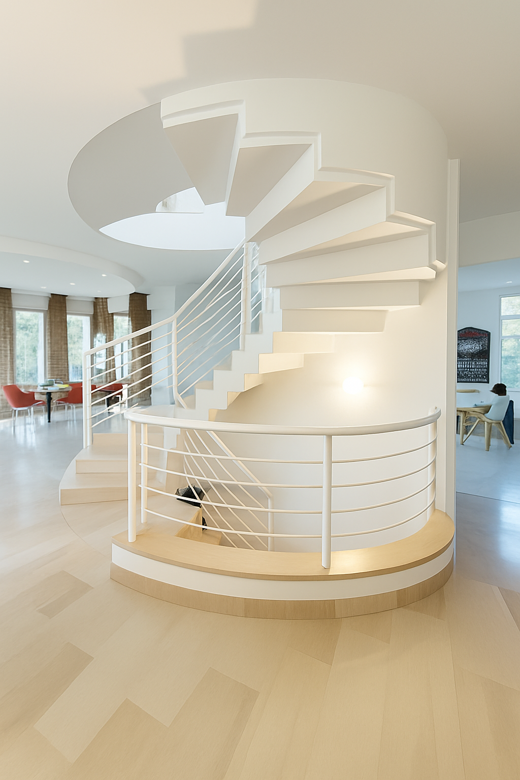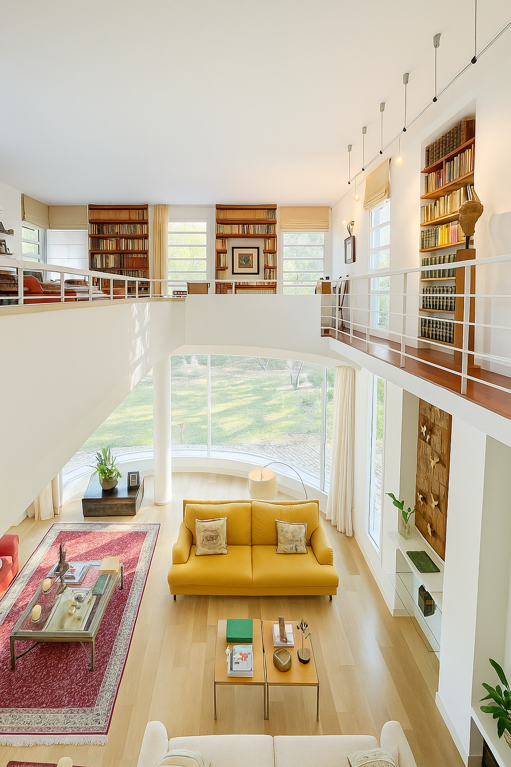 Im Obergeschoss befinden sich drei weitere Schlafzimmer, darunter eine großzügige Master-Suite mit Ankleidezimmer. Eine beeindruckende Bibliothek mit Galerie öffnet sich zum Wohnbereich und schafft einen inspirierenden Ort zum Arbeiten oder Entspannen.