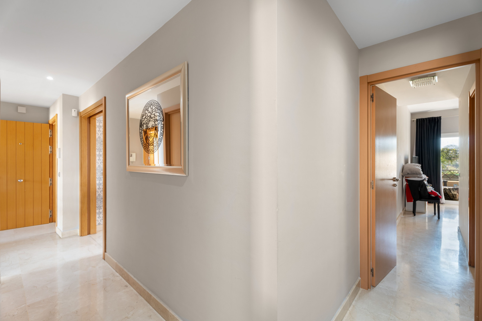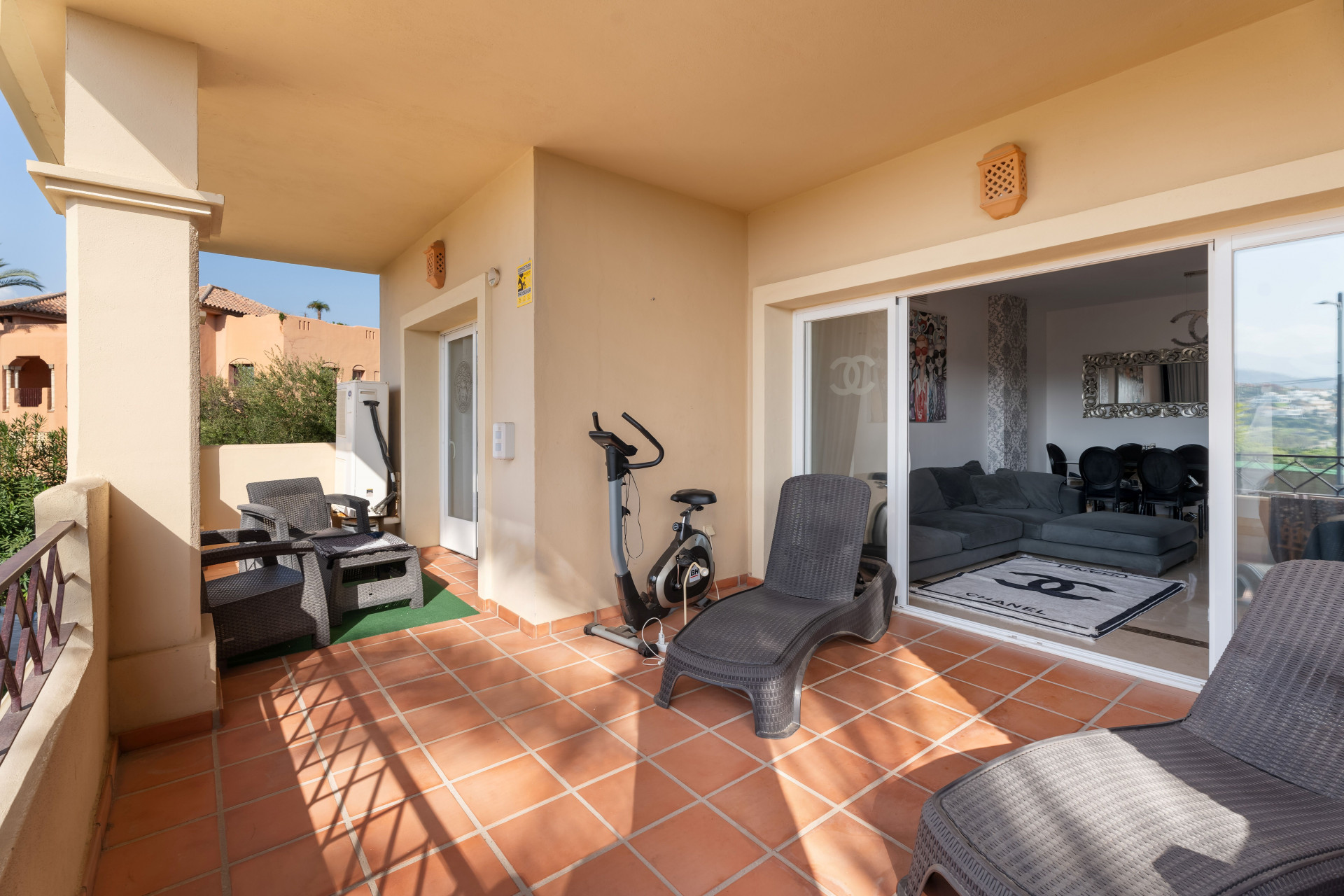 Leiligheten tilbyr 3 velutstyrte soverom med innebygde garderober, 2 fullt utstyrte bad og et romslig, fullt utstyrt kjøkken. Den koselige stuen åpnes på en stor vest-vendt terrasse, som også kan nås fra hovedrommet.