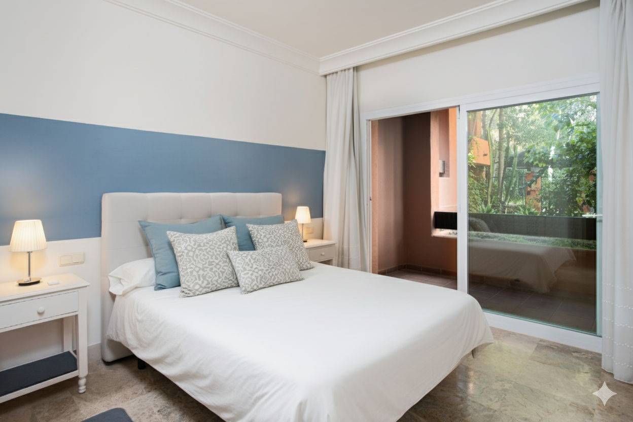 Located in one of the most exclusive and peaceful developments in Nueva Andalucía, this elegant ground floor apartment offers the perfect blend of comfort, privacy, and Mediterranean style. It features two spacious bedrooms and two bathrooms, one of them en-suite, as well as a fully equipped independent kitchen with a laundry area. The bright living-dining area opens onto a large private terrace with direct access to the pool, ideal for enjoying outdoor living all year round. The property also includes a private parking space and storage room. Set within a gated community with 24-hour security, surrounded by over 13,000 m² of tropical gardens, a lake, and a large swimming pool, it’s an ideal choice as a permanent residence, holiday home, or investment. Just minutes from Puerto Banús, top golf courses, and all essential amenities.