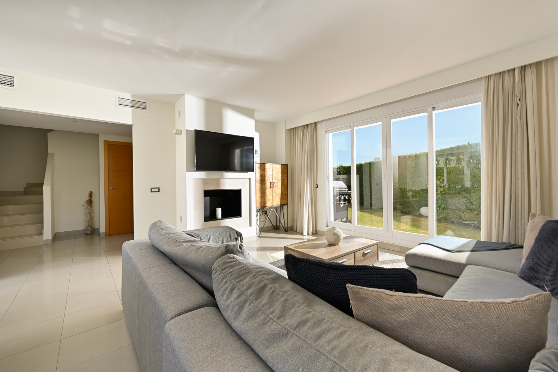 This charming semi-detached house is located in a quiet and well-connected area, making it ideal for those seeking comfort and quality of life. The property faces southwest, making it incredibly bright, and is spread over two floors. On the ground floor, it features a cozy open-plan living-dining room with a fireplace that opens onto both front and rear terraces, an independent kitchen with access to a patio/laundry area, and a garden that wraps around the right side of the house, from the front patio to the rear. As a corner unit, it benefits from having a larger garden. This floor also includes a third bedroom, a full bathroom, and a storage room.