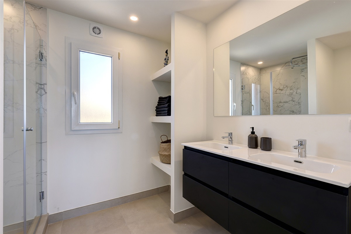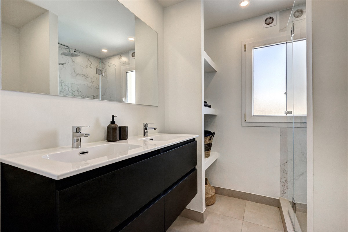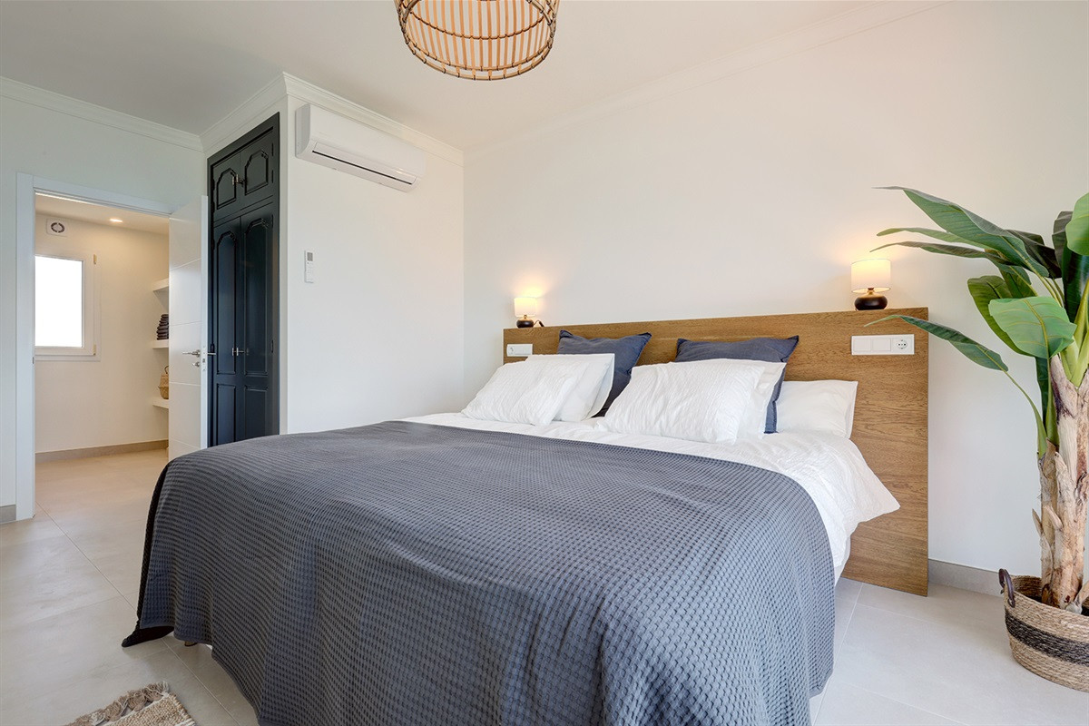 The open-plan living and kitchen area is bathed in natural light, with floor-to-ceiling windows framing the spectacular views of the Mediterranean. This space is designed for both relaxed everyday living and elegant entertaining.