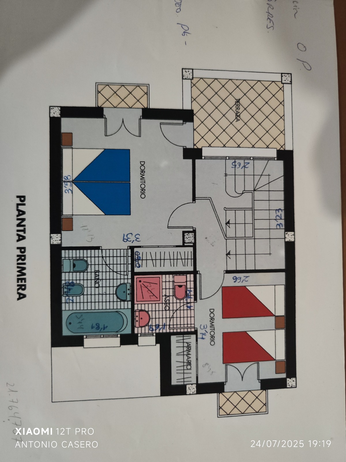 The house is distributed over three levels: a 80 m² basement; the main floor, which includes a kitchen, living-dining room with fireplace, guest toilet, terrace, and private pool measuring 7 × 3 m; and the upper floor with two en-suite bedrooms and a terrace that can be glazed.