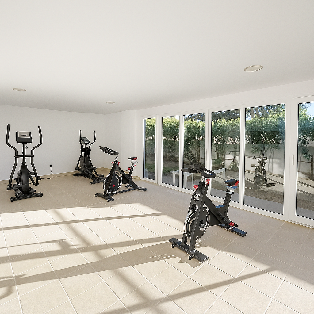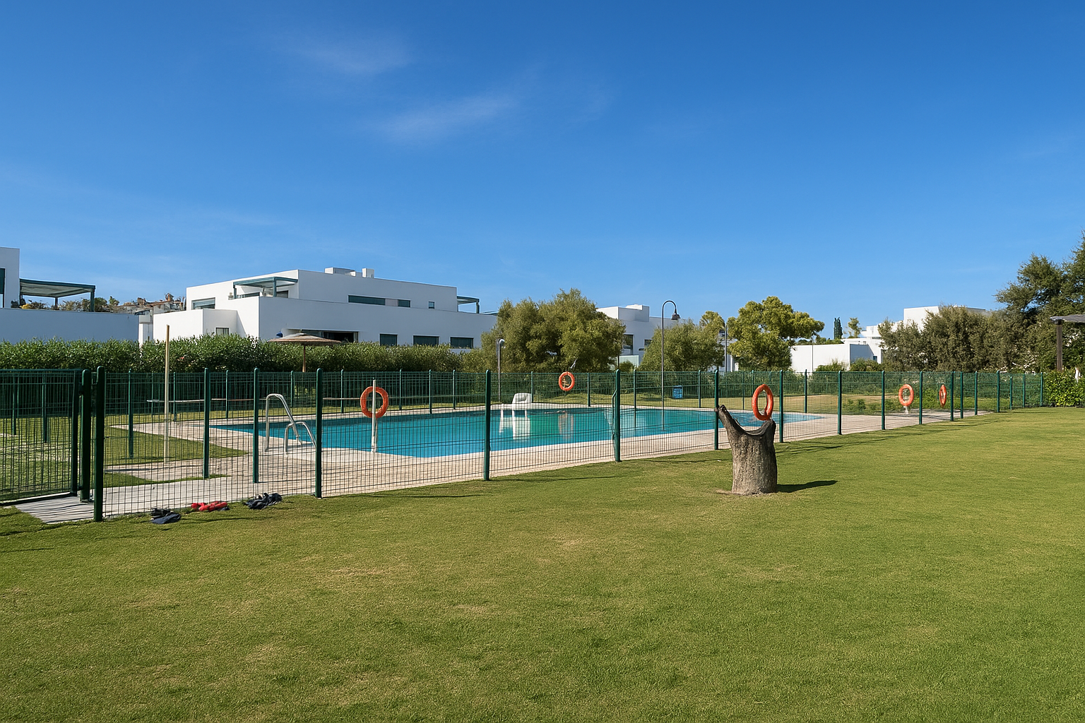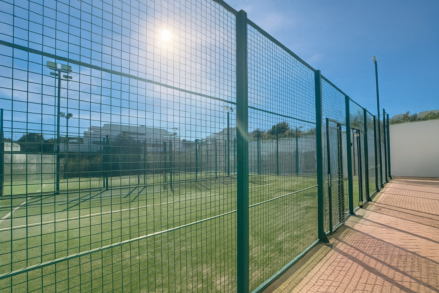 Residents enjoy access to exceptional communal facilities set within nearly five hectares of natural surroundings, including an 8,000 m² leisure area with a swimming pool, paddle courts, gymnasium, and scenic walking trails through the cork oak forest.
