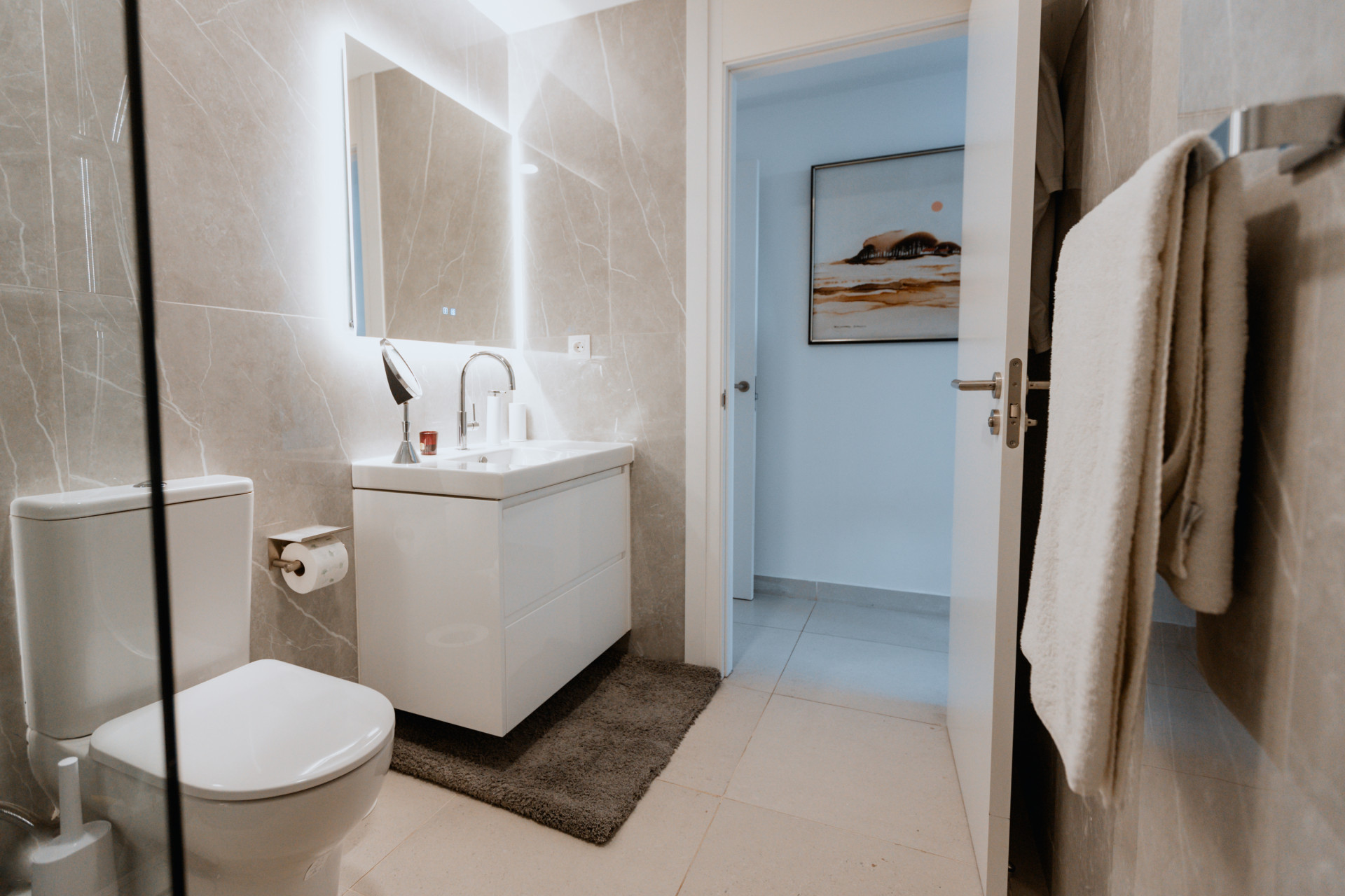 At the heart of the home lies a bright, open-plan living and dining area with an integrated kitchen, seamlessly connected to the private garden and expansive terraces. Benefiting from its orientation, the apartment is bathed in natural light throughout the day, while the outdoor spaces invite you to relax and enjoy the serene views of the surrounding cork oak forest.