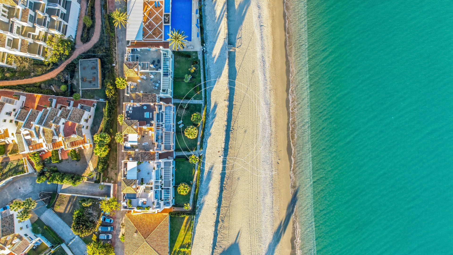 The complex features classic Andalusian architecture, a large communal pool surrounded by lush greenery, and direct access to the beach and seaside promenade—ideal for leisurely walks, cycling, or simply enjoying the Mediterranean climate.