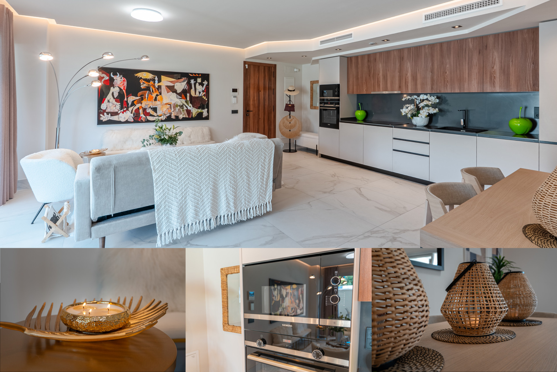 With high-quality finishes throughout, the apartment features a bright open-plan living area, a fully fitted kitchen, and two well-proportioned bedrooms with fitted wardrobes. Large glass doors connect the interior with the outdoor spaces, creating a natural flow ideal for relaxation or entertaining.