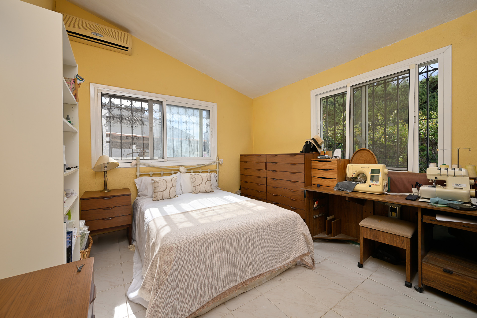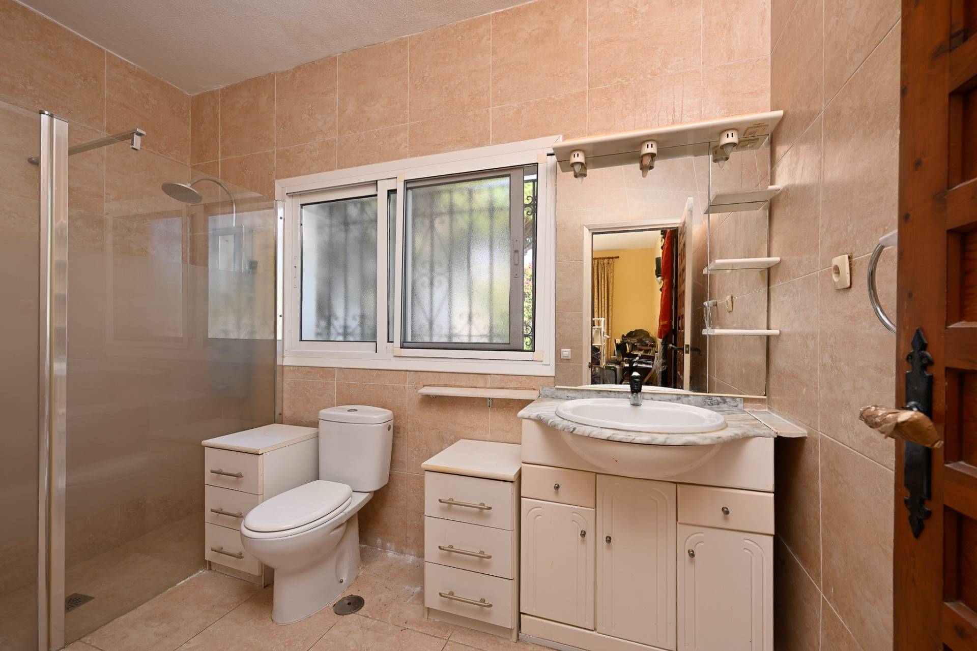 The villa offers a bright and open living area, a separate kitchen, and three well-sized bedrooms, each with its own en-suite bathroom, giving the property a great sense of privacy and convenience. Although the villa is in need of renovation, its spacious layout and prime location provide immense potential for modernisation and value growth.
