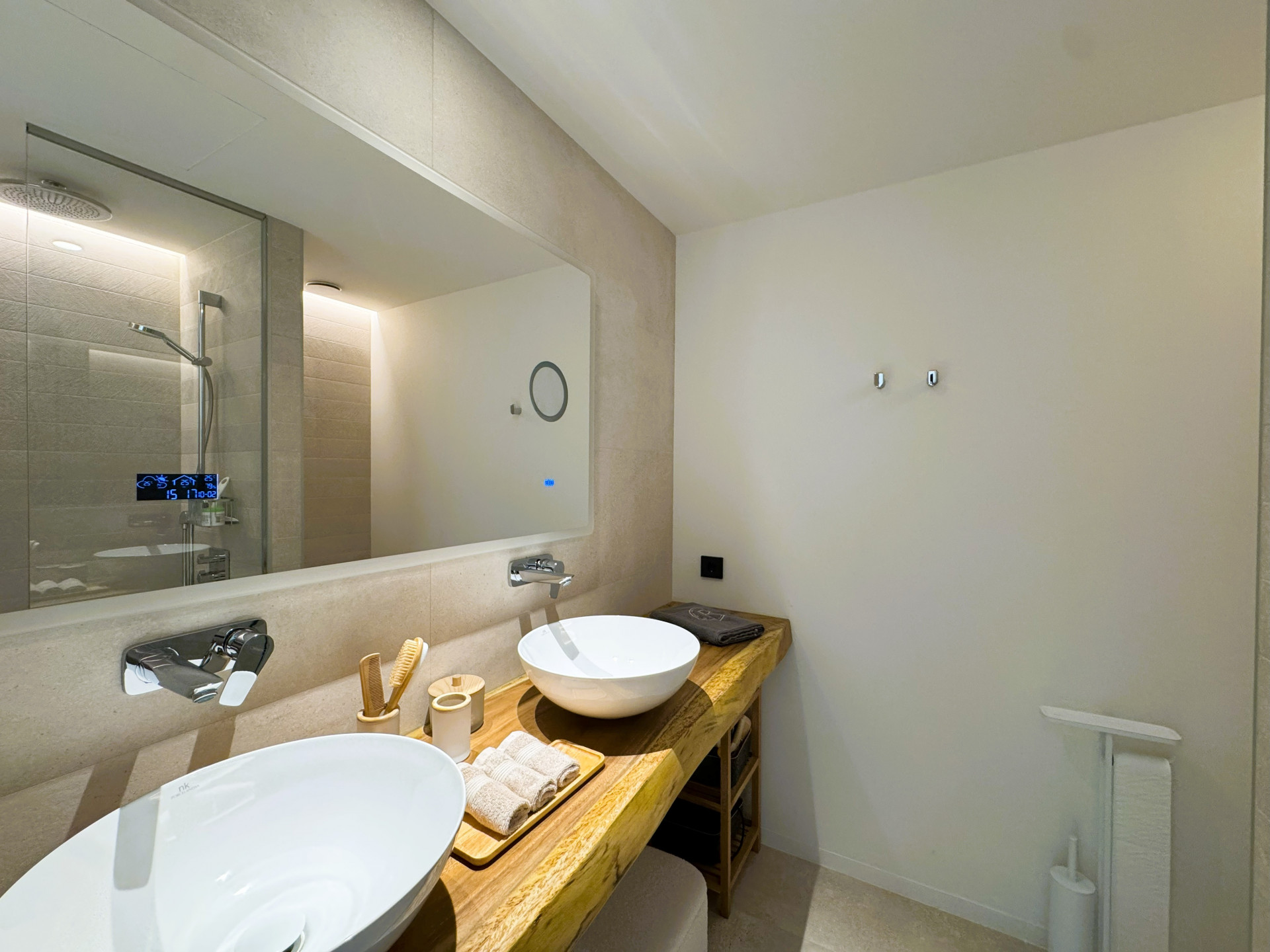 The apartment features two spacious bedrooms and two modern bathrooms, complemented by a guest toilet for added convenience. The interiors are fully furnished and finished to an excellent standard, with a fully fitted kitchen equipped for both everyday living and entertaining. Double glazing and electric blinds ensure comfort and privacy, while air conditioning maintains a pleasant indoor climate throughout the year. Residents benefit from a private garage, a storage room, and lift access, making the property practical as well as stylish.